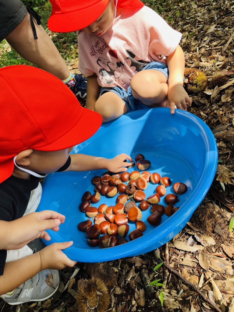 あかつき幼稚園には裏山に栗の木があり、栗拾いを楽しむことができます。